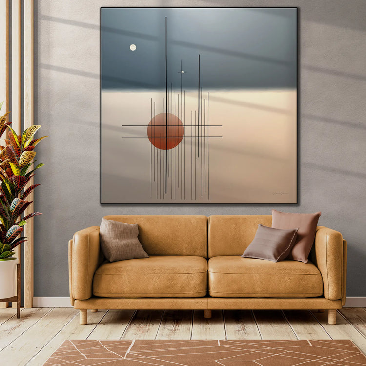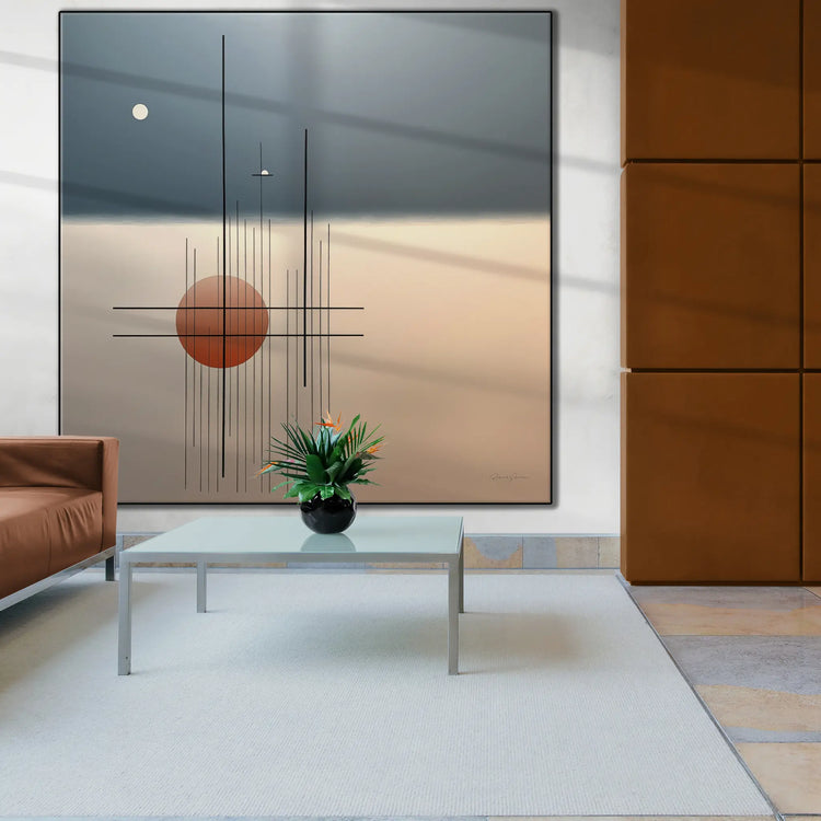 La calma tavolozza di colori invita alla contemplazione e conferisce un'aria di sofisticatezza e modernità a qualsiasi spazio. "Trinity" è un pezzo versatile, adatto a un interno minimalista, a un ufficio che cerca un tocco di calma precisione, o a uno spazio vitale progettato attorno ai principi dello zen e della tranquillità.